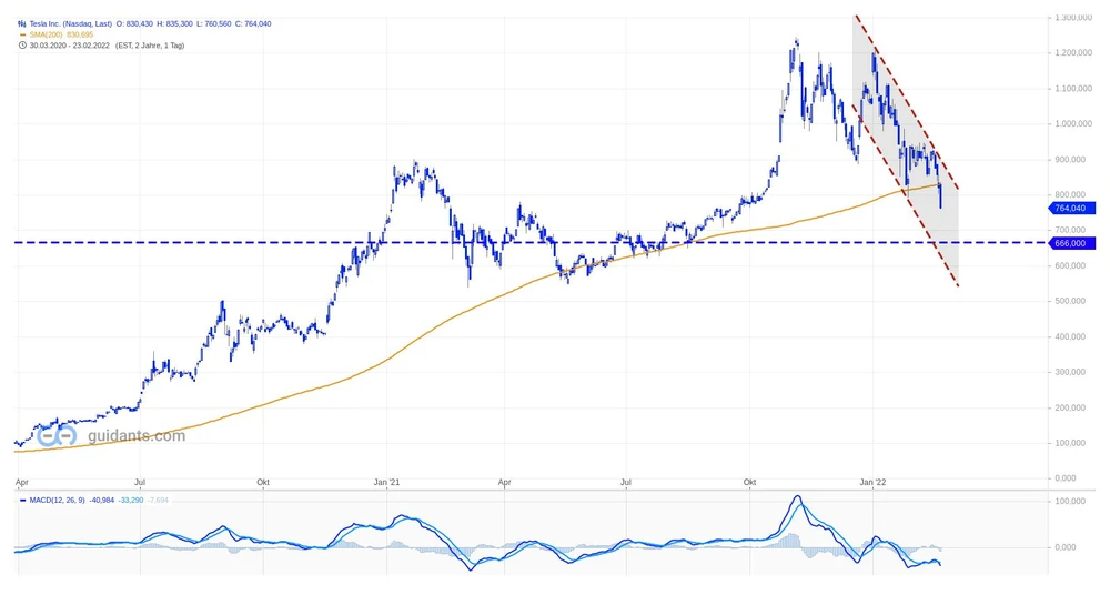 „Die Aktie von Tesla kennt aktuell nur eine Richtung. Die nach unten. Der ohnehin schon intakte Abwärtsmodus wurde nun noch verstärkt durch das Unterschreiten der 200-Tage-Linie. Diese tendiert bei 830,70 Dollar. Der gestrige Schlusskurs an der Nasdaq betrug 764,04 Dollar. Die markttechnischen Indikatoren sind ebenfalls alles andere als erfreulich. MACD sowie Slow-Stochastik im freien Fall und die Bollinger-Bänder weiten sich aus. Trotzdem könnte bei 718 Dollar eine etwaige Unterstützung verlaufen. Bricht diese allerdings auch, ist der Weg frei bis 666 Dollar. Diese Entwicklung würde sich dann nahtlos an das „Death-Cross“ vom 16.02.2022 anreihen. Vor gut einer Woche unterschritt die 38-Tage-Linie die 100-Tage-Linie", sagt Charttechnik-Experte Martin Utschneider von Donner & Reuschel.
