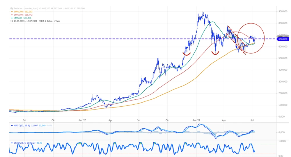 Wie geht es mit der Aktie von Tesla weiter? Seit Tagen tanzte das Papier knapp oberhalb der 50- sowie der 200-Tage-Linie. Zu Wochenbeginn machte das Papier einen deutlichen Satz nach oben und schaffte den Sprung über die 100-Tage-Linie bei 659 Dollar.