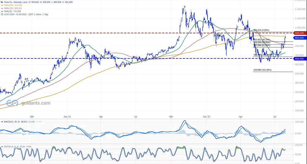 Tesla ist nach wie vor der Trendsetter unter den E-Autobauern. Die Zahlen waren gut und Tesla hat erneut gezeigt, dass man in der Lage ist, die Lieferkettenprobleme und die Versorgungsengpässe mit Chips weitaus besser zu meistern als die Konkurrenz. Aus charttechnischer Sicht bleibt das Momentum positiv. Die 200-Tage-Linie verläuft zur Stunde bei rund 910 US-Dollar. Diese wird aktuell getestet und stellt die nächste Hürde zur Fibonacci-Linie bei 953 US-Dollar dar.