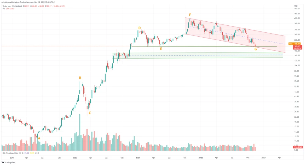 Die Aktie von Tesla steht kurz davor, den langfristigen Aufwärtstrend zu brechen. Während sie zwischen Mai 2019 und Oktober 2021 eine saubere Aufwärtsstruktur mit höheren Hochs und Tiefs (Punkte A bis F) etablieren konnte, hat die Korrektur die Kursgewinne des letzten Impulses (von E bis F) komplett in Luft aufgelöst.