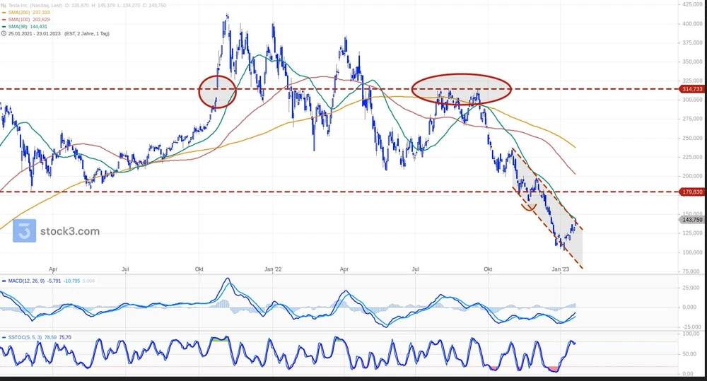 "Dieses Niveau entspricht sowohl der 38-Tage-Durchschnittslinie als auch der oberen Linie des seit dem 01.11.2022 intakten Abwärtsmodus. Aktuell tendiert der Trendfolge-Indikator MACD nach oben. Zudem signalisiert die Slow-Stochastik ein Kaufsignal. Sie ist per dato noch sehr knapp nicht (!) überkauft. Daher verdichten sich die Zeichen, dass die 144,43 US-Dollar zum kurzfristigen „Zünglein an der Waage“ werden. Ein Überschreiten dieser Marke könnte Potential bis 166,19 US-Dollar freisetzen. Schafft es der Aktienkurs allerdings nicht, nachhaltig über die 144,43 zu steigen, dann bleibt der aktuelle Abwärtsmodus intakt“, erklärt Martin Utschneider.