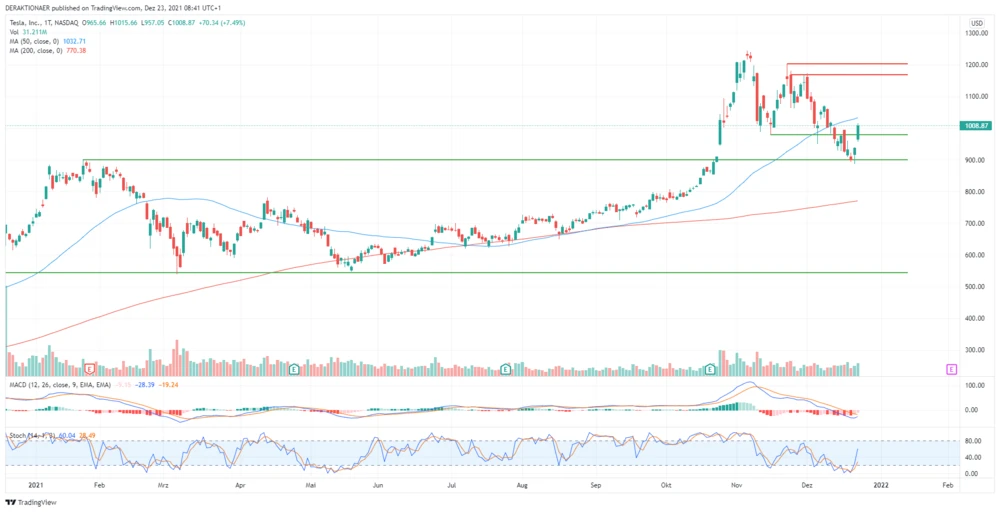 Dank der Top-News startete die Tesla-Aktie am Mittwoch bereits mit einem Kursplus von 3,7 Prozent in den Tag. Unter hohen Handelsumsätzen und zunehmendem Momentum kletterte sie bis Handelsschluss um weitere 4,8 Prozent gen Norden. Damit eroberte der Wert nicht nur den Widerstand am November-Tief bei 978,60 Dollar zurück, sondern stürmte zudem über die 1.000-Dollar-Marke.