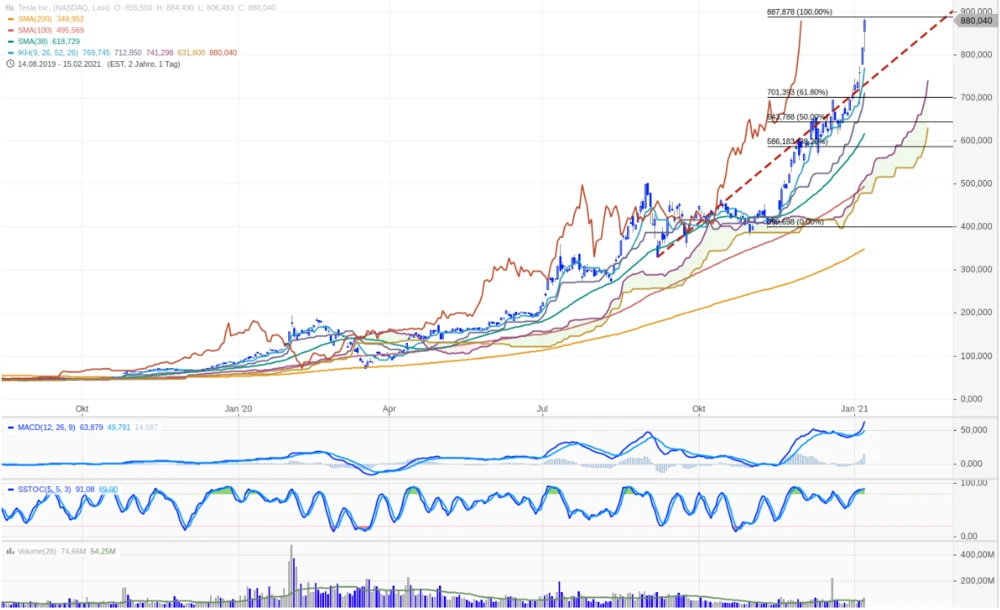 „Die Tesla-Aktie eilte zuletzt von Hoch zu Hoch. Zum Ende vergangener Woche zeigte die Tesla-Aktie abermals eine auffällige Tagesschwankung. Es lässt sich weiterhin nicht wegdiskutieren, dass die markttechnischen Indikatoren auffällig überhitzt sind. Daher bieten die Fibonacci-Retracements eine gute Orientierung für die nächstliegenden Absicherungen.