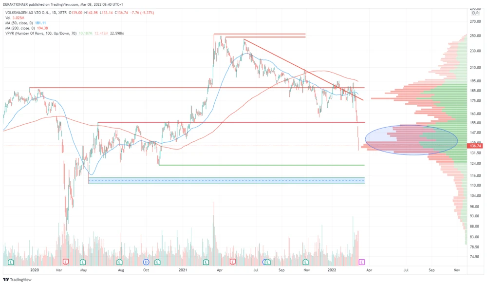 Die Aktien von Volkswagen sind weiterhin auf Talfahrt. Seit Kriegsbeginn in der Ukraine hat der Titel bisher über 25 Prozent an Wert verloren. Selbst der angekündigte Bau eines neuen Werks speziell für Elektromodelle konnte keine Impulse liefern. Charttechnisch betrachtet sieht die Lage nun dramatisch aus.