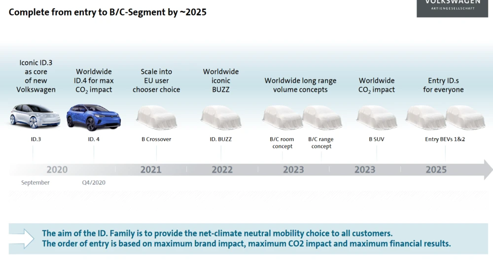 Im Vergleich zu Tesla scheint VW mit einem Börsenwert von 75 Milliarden Euro fast ein Sonderangebot:. Längerfristig sind im Konzern mehr als 70 vollelektrische Modelle geplant. Nach dem VW ID.3 und ID.4, Audi Q4 e-tron und Porsche Taycan gehören dazu ab 2021 das größere SUV-Coupé ID.5, der Skoda Enyaq, der Seat Cupra el-Born sowie später der Elektro-Bulli ID.Buzz. Bis 2024 sind etwa 35 Anläufe auf Basis des Elektro-Baukastens geplant. Bis 2025 soll ein Fünftel der Auslieferungen auf E-Autos entfallen. Laut Brandstätter gibt es "intensive Diskussionen" über kleine ID-Ableger.