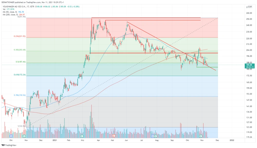 Im Vorfeld der Quartalszahlen, die VW am 28. Oktober veröffentlicht hatte, startete die Aktie einen Erholungsversuch. Dabei konnten die mittelfristige Abwärtstrendlinie bei 191 Euro, der GD50 bei 194,44 Euro, die Hürde an der 200-Euro-Marke und der GD200 bei 203 Euro überwunden werden.