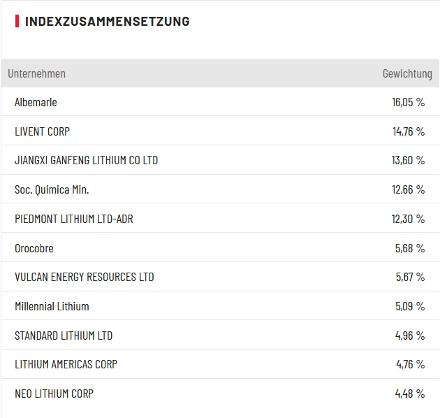 Den größten Index-Anteil macht das amerikanische Unternehmen Albemarle aus. Neben der Entwicklung und Herstellung von Spezialchemikalien besitzt das Unternehmen eine eigene Lithium-Sparte. Die zweithöchste Gewichtung hat der in Philadelphia ansässige Lithiumproduzent Livent. Das Unternehmen produziert Lithiumverbindungen einschließlich Lithiumhydroxid, die in Lithium-Ionen-Batterien verwendet werden. Ende März schloss der deutsche Autobauer BMW einen Mehrjahresvertrag über knapp 300 Millionen Euro mit dem US-Unternehmen ab. Neben BMW hat auch der amerikanische Auto-Gigant Tesla einen Liefervertrag mit Livent.