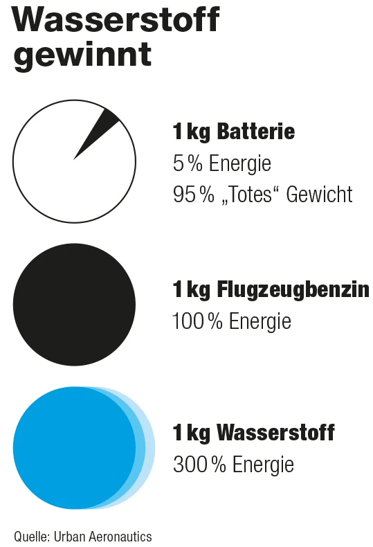 Haben Sie schon einmal Ihr E-Bike oder eine Spielzeugdrohne hochgehoben? Die enthaltenen Batterien sind sehr schwer. Zwar hat Tesla-Chef Elon Musk nun in Aussicht gestellt, dass ab 2023 die Leistungsdichte von Lithium-Ionen-Zellen so gesteigert wird, dass auch deren Verwendung in Flugzeugen Sinn macht. Doch gerade beim Einsatz in Drohnen und Fluggeräten, bei denen Gewicht eine große Rolle spielt, hat die Brennstoffzelle in Verbindung mit Wasserstoff unschlagbare Gewichtsvorteile.