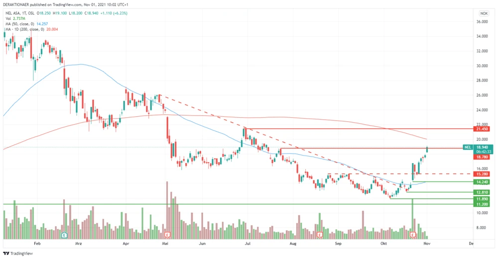 Titel aus der Wasserstoff-Branche erleben seit einigen Tagen wieder starken Zulauf. Besonders beeindruckend ist das Comeback bei der Nel-Aktie. Der Titel kämpfte Anfang Oktober noch mit dem Jahrestief bei rund 12 Norwegische Kronen (NOK). Innerhalb von vier Wochen verteuerte sich der Preis um 58 Prozent.