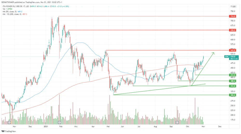 Auch die Aktie von ITM Power startet eine Gegenbewegung. Der Titel knackt am heutigen Montag die psychologisch wichtige 500-Pence-Marke. Durch das positive Momentum stehen die Chancen gut, dass in den nächsten Wochen der massive Widerstand bei rund 540 Pence überwunden wird. Die Erholung wird vom GD200 bei 457 Pence unterstützt.