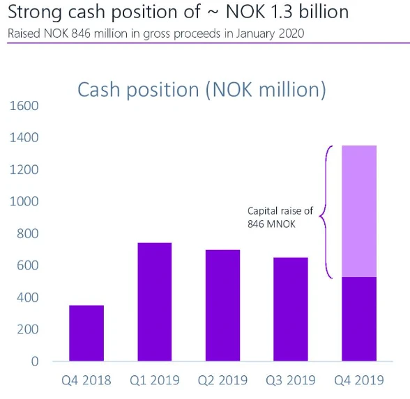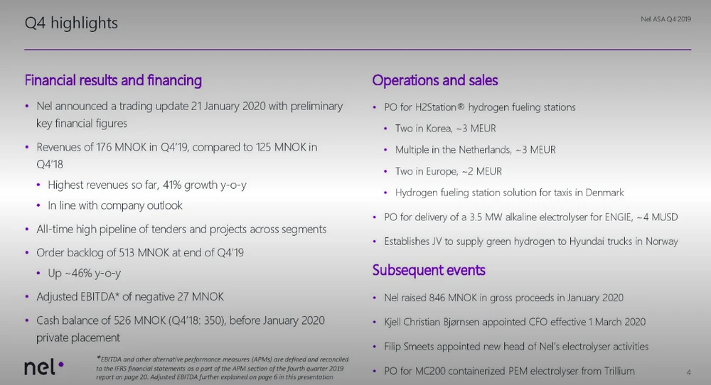 Der Wasserstoff-Spezialist verfügt nach der Kapitalmaßnahme im Januar rund 1,3 Milliarden Kronen (etwa 126 Millionen Euro) an Cash. Das kann die Gesellschaft gebrauchen. Denn noch kann Nel nicht die Umsatzsteigerungen in Profitabilität ummünzen. So stand im vierten Quartal 2019 ein negatives bereinigtes EBITDA von 26,8 Millionen Kronen in den Büchern.