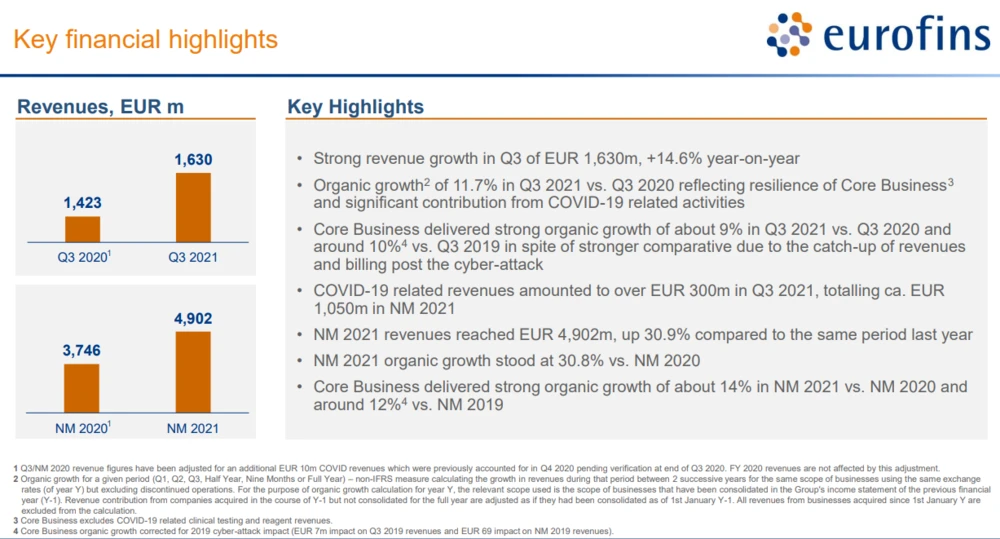 Der Bioanalytik-Spezialist steigerte zwischen Juli und September die Erlöse um 14,6 Prozent (11,7 Prozent organisch) auf 1,63 Milliarden Euro. Im ersten Halbjahr verzeichnete die Laborgruppe jedoch viel stärkere Zuwächse, sodass in den ersten neun Monaten des laufenden Geschäftsjahres ein Erlösplus von 30,9 Prozent auf 4,90 Milliarden Euro in den Büchern steht.