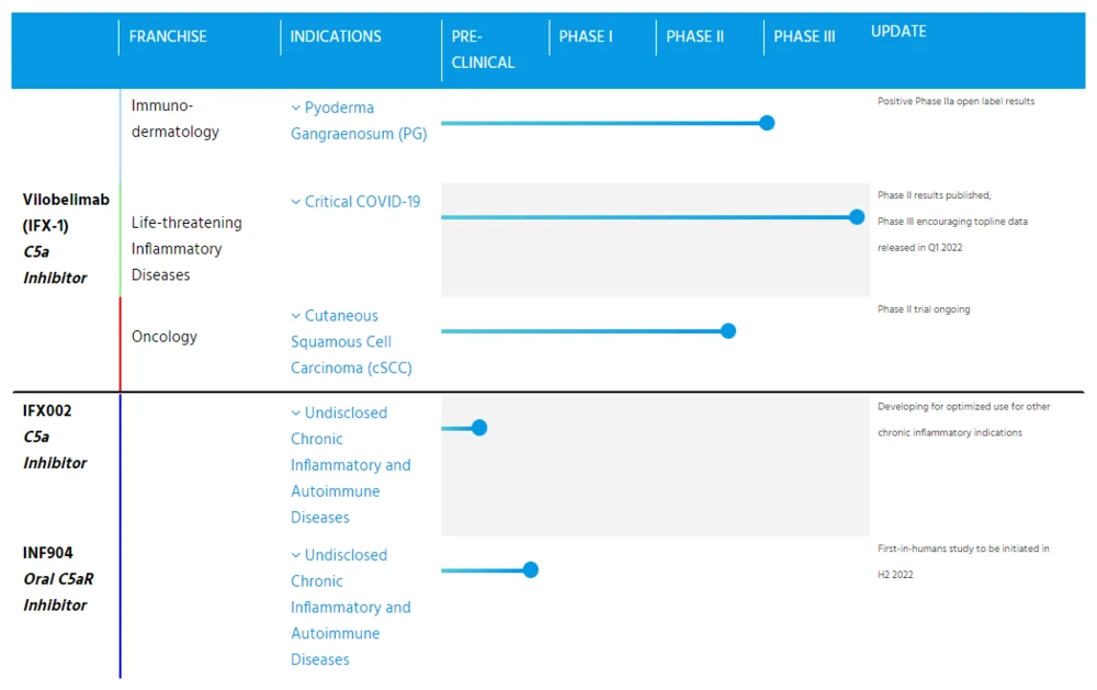 Noch in einer frühen Phase der klinischen Entwicklung (derzeit in Phase-1-Studie) steckt indes die Substanz INF904. InflaRx will hier weitere Daten im zweiten Halbjahr kommunizieren. Im Erfolgsfall streben die Thüringer an, den Wirkstoff zur Behandlung von chronischen Autoimmun- und Entzündungskrankheiten weiterzuentwickeln.