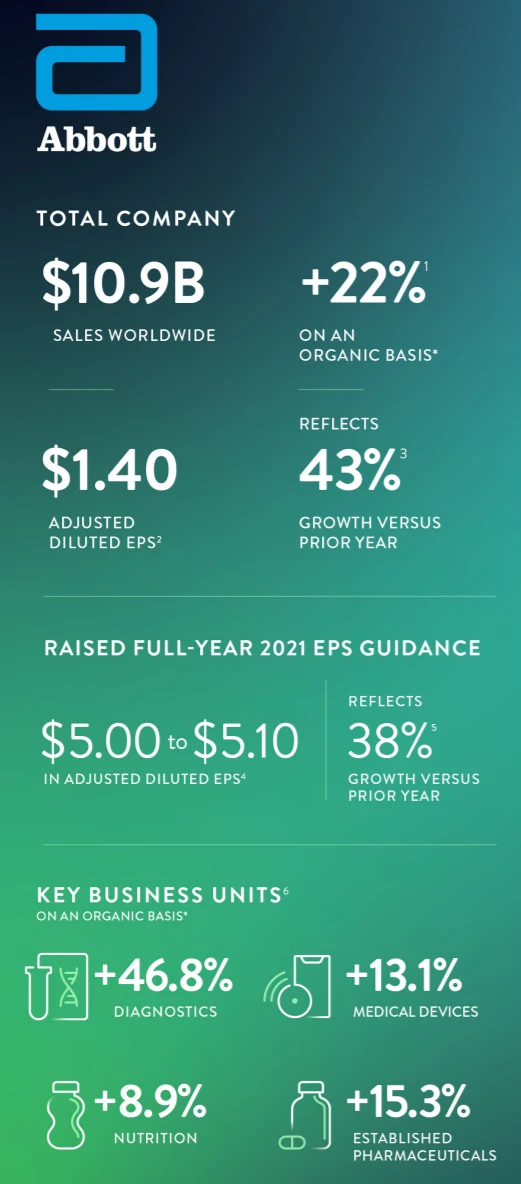 Abbott Laboratories verzeichnete in allen Kerngeschäften ein deutliches Wachstum. Positiv heraus ragte einmal mehr das Diagnostik-Business mit einem organischen Zuwachs von knapp 47 Prozent. Alles in allem erlösten die Amerikaner im dritten Quartal 10,9 Milliarden Dollar und damit knapp 1,4 Milliarden Dollar mehr als von Analystenseite erwartet. Das wiederum bedeutete ein organisches Wachstum von satten 22,4 Prozent.