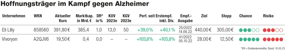 Die Aktie von Eli Lilly ist mittlerweile heiß gelaufen und mit einem 2023er-KGV von 50 auch nicht mehr günstig. Weitaus mehr Fantasie hat die Aktie von Vivoryon. Hier sind in den kommenden Monaten richtungsweisende News zu erwarten. Kann Vivoryons Alzheimer-Produktkandidat überzeugen, dürfte auch nach der Kursverdopplung seit der Empfehlung des AKTIONÄR das Potenzial der Aktie bei Weitem noch nicht ausgeschöpft sein. Die Aktie bleibt aber ganz klar hochspekulativ.