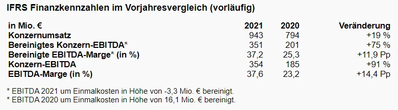 Im Jahr 2021 stiegen die Erlöse laut vorläufigen Erhebungen um 19 Prozent auf 943 Millionen Euro (Prognose: Wachstum von 15 bis 20 Prozent). Das bereinigte EBITDA legte sogar um satte 75 Prozent auf 351 Millionen Euro zu. Hier stellte Dermapharm zuletzt ein Plus von 70 bis 75 Prozent in Aussicht.