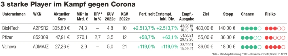 DER AKTIONÄR sieht am Impfstoffmarkt BioNTech am besten positioniert – auch was die Chancen über Corona hinaus angeht. Valneva gilt weiterhin als großer Hoffnungsträger, was einen Totimpfstoff angeht. Beide Papiere bleiben aber spekulativ. Pfizer ist das ideale Investment für all diejenigen, die sowohl auf die Impfung als auch auf ein höchst aussichtsreiches Medikament setzen möchten. Allerdings begrenzt die Konzerngröße das Potenzial der Aktie. Anleger, die vom Impfstofftrend profitieren, aber kein Einzelinvestment wagen möchten, liegen beim Impfstoff-Aktien Index des AKTIONÄR richtig. Mit dem Zertifikat (WKN DA0AB4) können Anleger 1 zu 1 die Entwicklung des Index nachbilden.