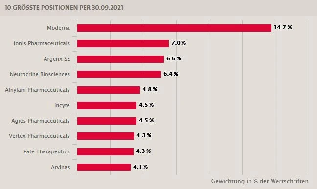 Die Aktie von Moderna bleibt aber ganz klar das Top-Investment von BB Biotech. Per Ende September betrug der Anteil von Moderna am Portfolio 14,7 Prozent. Auf Platz 2 folgt mit deutlichem Abstand mit 7,0 Prozent Ionis Pharmaceuticals.