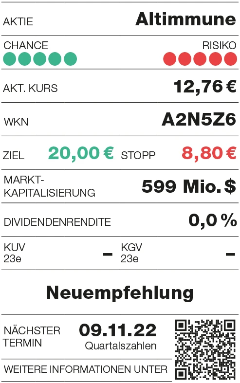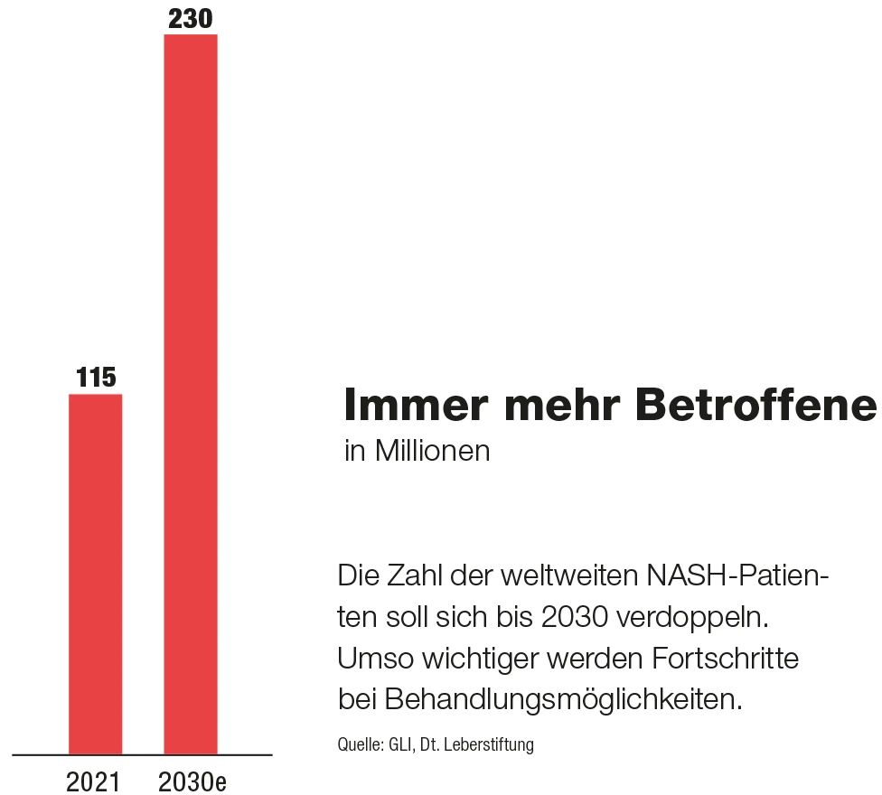 Laut dem Global Liver Institute (GLI) sind von NASH mehr als 115 Millionen Menschen weltweit betroffen. Experten gehen davon aus, dass sich die Zahl bis 2030 verdoppeln wird, und sprechen von einer versteckten Epidemie. Umso wichtiger werden entsprechende Behandlungsmöglichkeiten, um den Entzündungsvorgang zu hemmen und so das Voranschreiten der Vernarbung der Leber zu beeinflussen. Dazu laufen derzeit aussichtsreiche Studien, zuletzt gab es einige Erfolge. Eines der Unternehmen mit positiven Studiendaten zur Behandlung von NASH ist das US-Biotech- Unternehmen Altimmune.