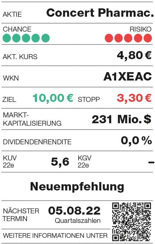 Derzeit läuft eine weitere Phase-3-Studie. Daten hierzu erwartet das Unternehmen im dritten Quartal dieses Jahres. Fällt auch diese Studie positiv aus, dürfte im ersten Halbjahr 2023 der Zulassungsantrag folgen. Ein Erfolg dürfte zu einer Neubewertung der Aktie führen.