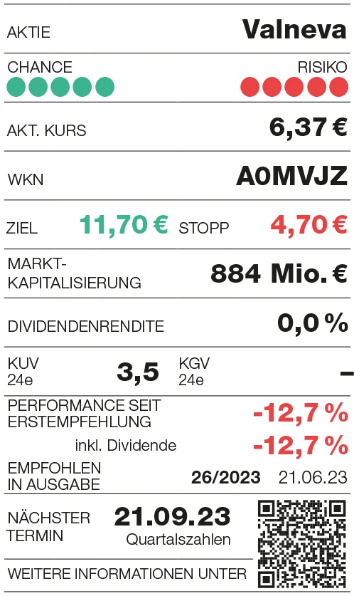 Die steigende Reiselust führt auch zu einer wachsenden Nachfrage nach Reise-Impfstoffen. Das könnte sich in den nächsten Zahlen bei Valneva, die Ende September veröffentlicht werden, bemerkbar machen. Zudem steht noch in diesem Jahr der wichtige US-Zulassungsentscheid für den Chikungunya-Impfstoff an. Hier könnte man einen wichtigen Markt erschließen. Der Kursrücksetzer infolge der Verschiebung der Entscheidung stellt eine interessante spekulative Kaufchance dar. Die weitere Pipeline sorgt für zusätzliche Fantasie.
