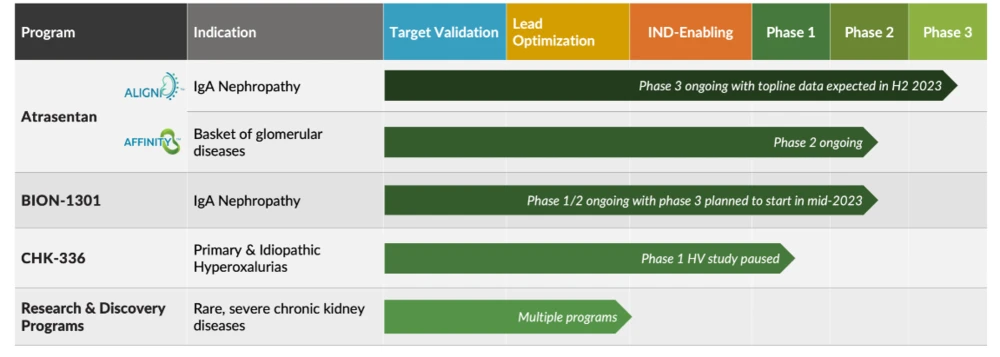 Zwei Wirkstoffe von Chinook Therapeutics befinden sich bereits in der fortgeschrittenen Entwicklungsphase. Zur Substanz Atrasentan sind im zweiten Halbjahr wichtige Daten zu erwarten. Fallen diese positiv aus, will Chinook Therapeutics das Mittel zur Behandlung der IgA-Nephropathie auf den Markt bringen.