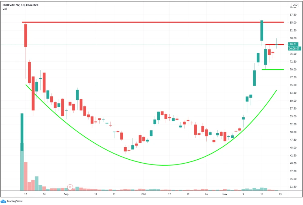 Beim Chartbild der CureVac-Aktie zeichnet sich aktuell eine stark bullishe Chartformation ab. Trader setzten sich an den genannten Marken auf die Lauer.