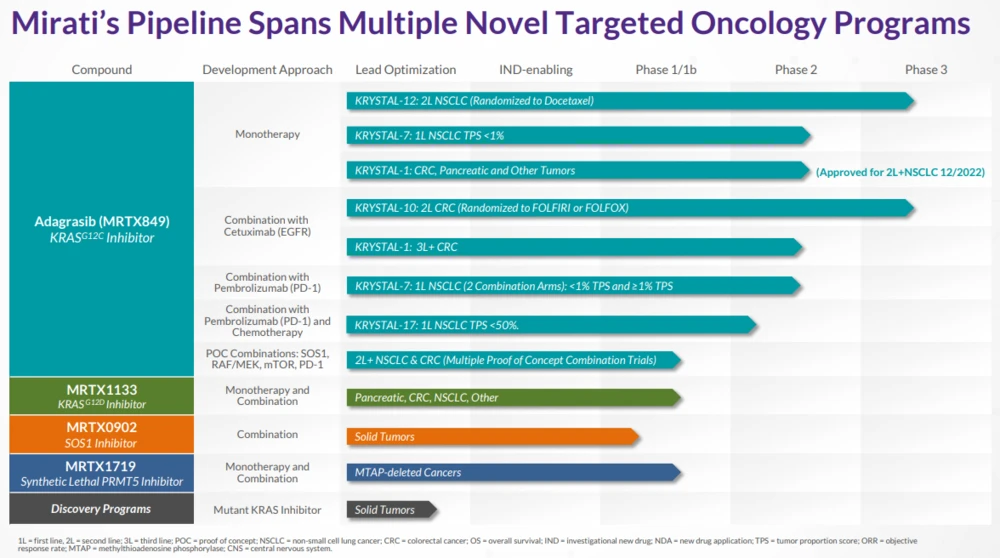 Das Gros der Mirati-Pipeline deckt derzeit die Substanz Adagrasib (Krazati) ab. Diese adressiert KRAS-G12C-Mutationen, die in verschiedenen Tumoren vorkommen. Darüber hinaus will Mirati – und nach dem erfolgreichen Abschluss einer Transaktion auch der Aufkäufer Bristol-Myers Squibb – weitere präzisionsonkologische Ansätze zur Marktreife führen.