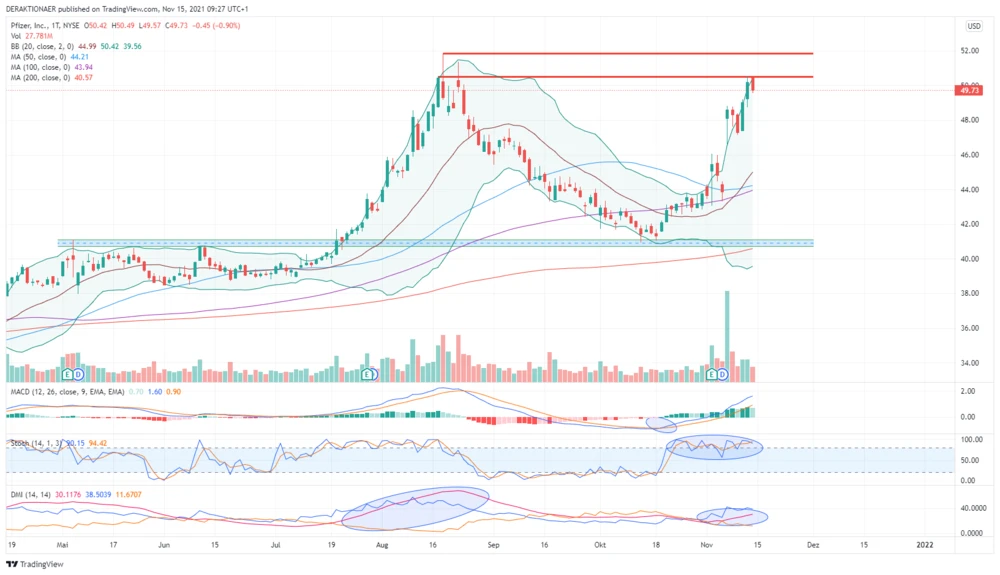 Der US-Pharmakonzern Pfizer hat zuletzt die Aktien der Corona-Impfstoffproduzenten durchgewirbelt. Vor rund eineinhalb Wochen hatte Pfizer gemeldet, dass das Unternehmen über eine wirksame Pille verfüge, die schwere Krankheitsverläufe bei Corona-Infizierten verhindern soll. Die Aktie legte folglich einen Höhenflug hin und steht jetzt an einer wichtigen Marke.
