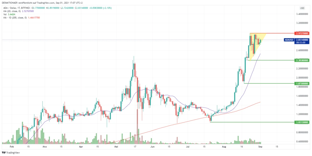Durch den starken Anstieg konnte ADA auch ein neues Allzeithoch bei 2,97 Dollar erreichen. Diese Marke stellt gleichzeitig auch den jüngsten Widerstand dar. Auf der Unterseite stützt der GD20 bei 2,52 Dollar sowie die Unterstützung bei 2,38 Dollar. Durch die leichte Konsolidierung der letzten Tage, formte der Kursverlauf ein sogenanntes steigendes Dreieck, welches in der Regel nach oben aufgelöst wird.