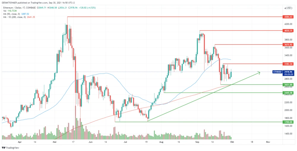 Am 21. September markierte der Ether-Kurs (ETH) nach einem starken Abverkauf ein Mehrwochentief bei 2.651 Dollar. In diesem Bereich verläuft auch der GD200, der aktuell eine wichtige Unterstützung darstellt. Im Anschluss konnten die Bullen das Ruder wieder an sich reißen, Seitdem pendelt der Kurs pendelt in einer Range stabil zwischen 2.700 bis 3.200 Dollar.