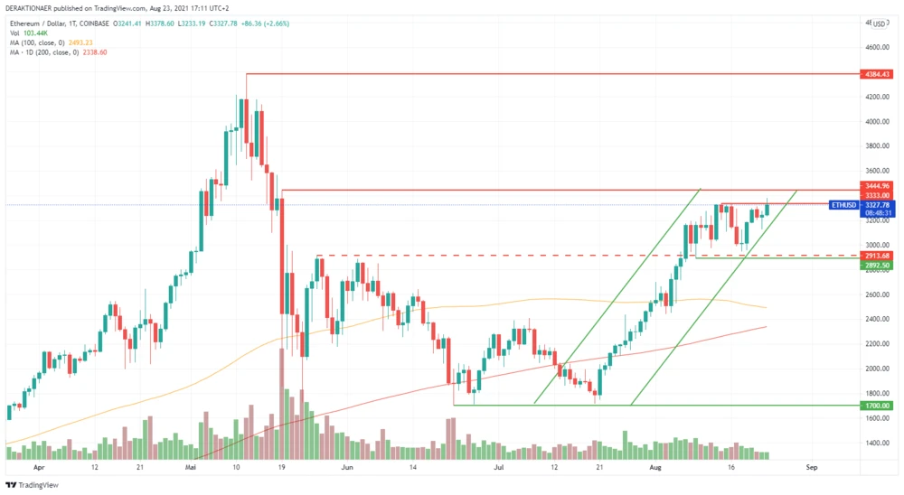 In der letzten Handelswoche legte der ETH-Coin allerdings eine Pause ein und konsolidierte in einer Range. Diese verlief vom Mehrwochenhoch und aktuellem Widerstand bei 3.333 Dollar bis zur Unterstützung bei 2.892 Dollar. Eine wichtige Verschnaufpause, da eine Überhitzung drohte.