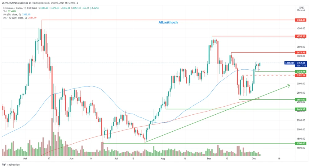 Nach dem Abverkauf im September und dem neuen Mehrwochentief bei 2.651 Dollar meisterte Ether (ETH) im Anschluss die Kehrtwende. Vom Tief aus verteuerte sich der Preis innerhalb von 14 Tagen um rund 30 Prozent. Auch der Widerstand bei 3.182 Dollar wurde überwunden und damit ein technisches Kaufsignal ausgelöst. Das Momentum stieg mit dem Ausbruch am 1. Oktober deutlich an und so legte der Kurs alleine an diesem Tag um über zehn Prozent zu.