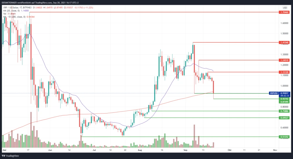 Die wichtige Unterstützung am GD200 bei 0,94 Dollar konnte dem massiven Abverkauf auch keine Paroli bieten. Der Kurs fiel auf ein Mehrwochentief bei 0,87 Dollar zurück. Allerdings kamen zum Nachmittag (MEZ) mutige Käufer zurück und so kletterte der Preis für einen XRP-Coin wieder bis an den GD200 heran. Damit summiert sich der aktuelle Tagesverlust auf rund elf Prozent.