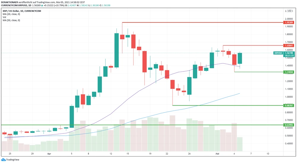 DER AKTIONÄR berichtete über die kurzzeitige Verschnaufpause bei der Ripple-Rallye. Zum Monatswechsel in den Mai markierte der Ripple-Kurs (XRP) noch ein neues Zwischenhoch bei 1,65 Dollar. Im Anschluss ließen Gewinnmitnahmen den Preis um bis zu 20 Prozent absacken. Das Tief bei 1,31 Dollar stellt aktuell eine technische Unterstützung dar.
