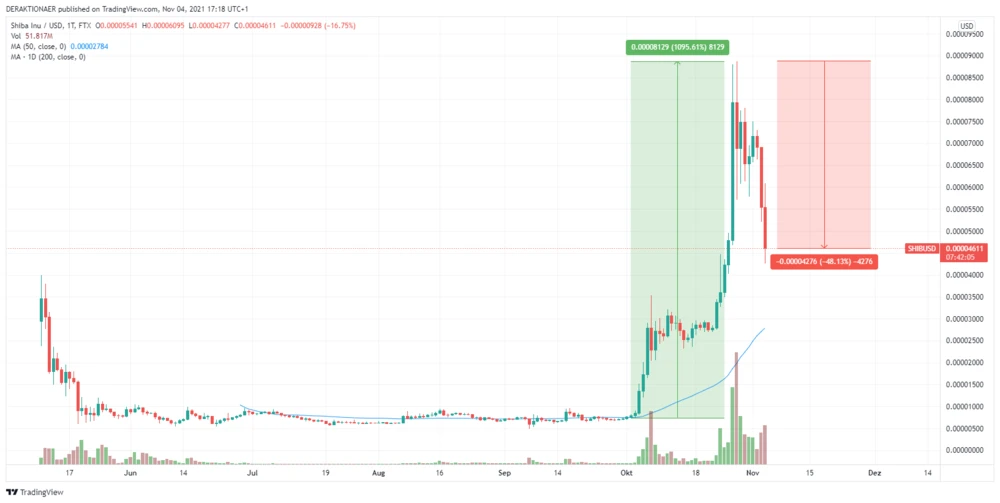 Im Sommer war es noch ruhig um den Shiba Inu Coin (SHIB) und der Kurs plätscherte ohne Richtung vor sich hin. Das änderte sich im Oktober schlagartig. Der SHIB wurde in extreme Höhen geschossen und der Preis verteuerte sich innerhalb weniger Wochen mehr als 1.000 Prozent. Dass es sich hierbei um keine nachhaltige Kursentwicklung handelt, ist unschwer zu erkennen.