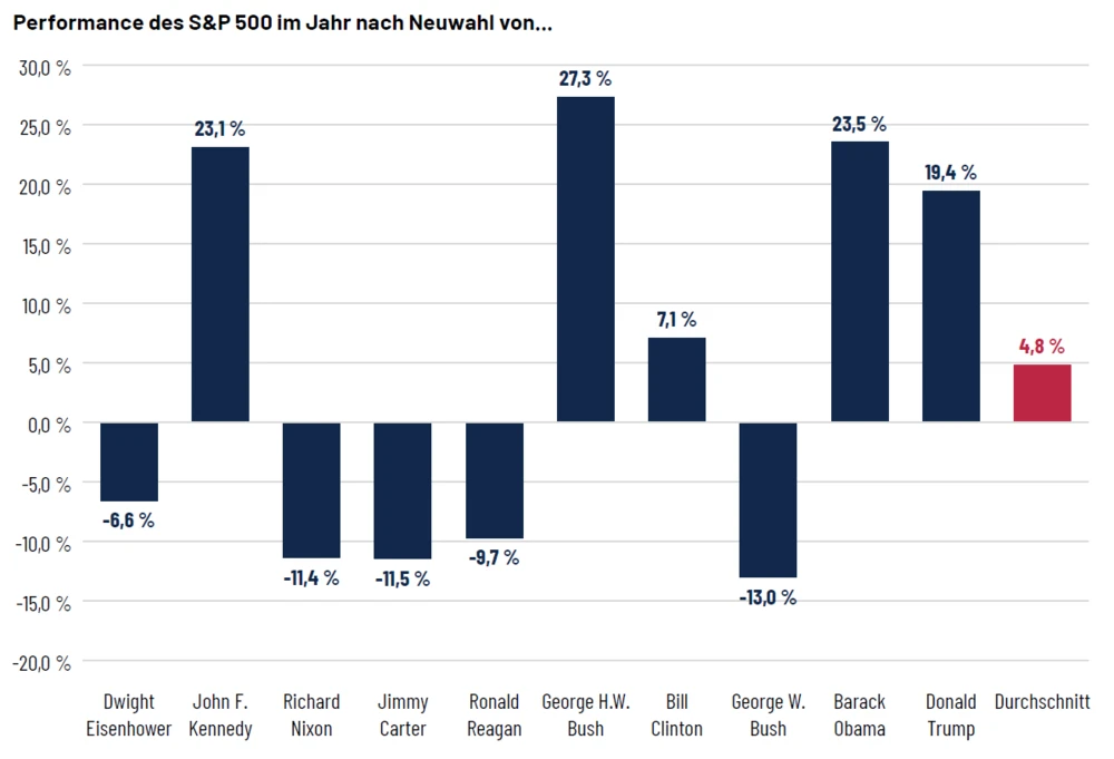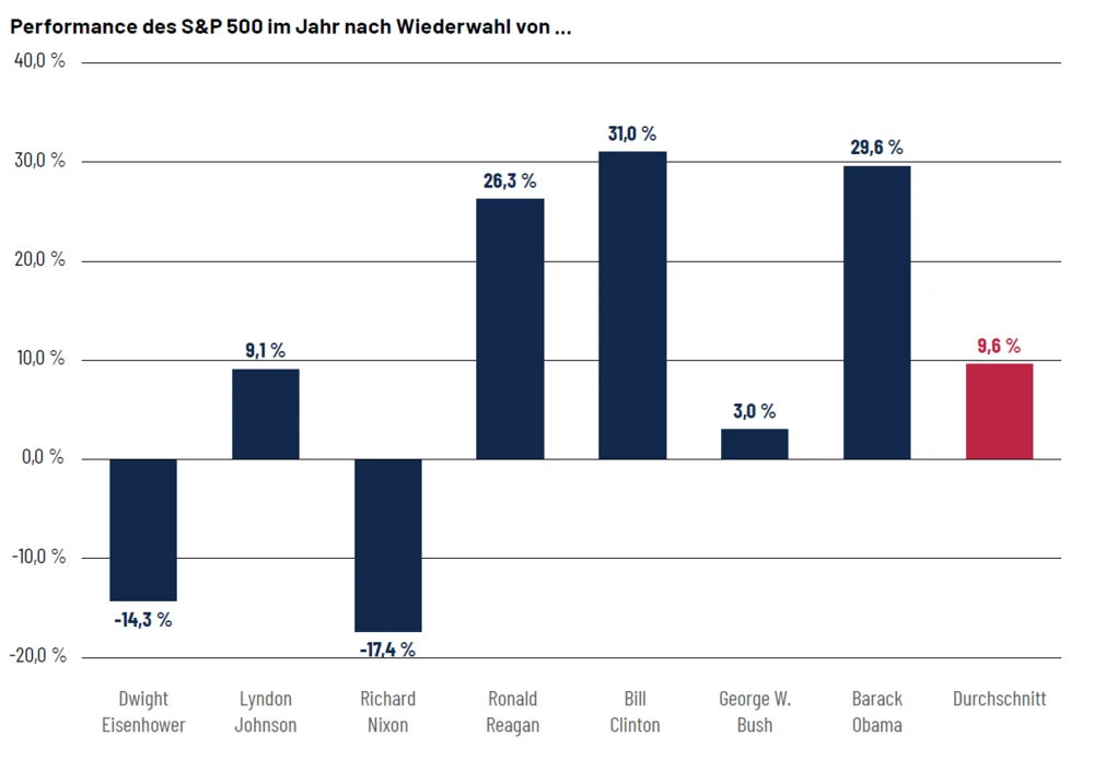 Bei Betrachtung der Wiederwahlen eines US-Präsidenten seit 1950 fällt auf, dass der S&P 500 im darauffolgenden Jahr im Durchschnitt um 9,6 Prozent zulegen konnte. Ein Kursanstieg konnte hierbei in fünf von sieben oder in 71,4 Prozent der Fälle verzeichnet werden. Nach der Wiederwahl von Ronald Reagan, Bill Clinton und Barack Obama ging es jeweils sogar um circa 30 Prozent nach oben.