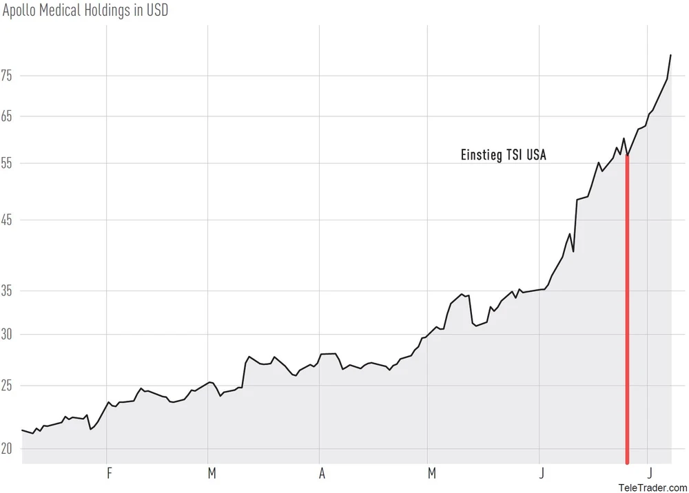 Dementsprechend befindet sich der US-Technologieindex Nasdaq 100 wieder auf der Überholspur. Anlegerlieblinge wie beispielsweise Apple oder Amazon konnten ihre Konsolidierungen beenden und bereits auf neue Hochs klettern. Auch wenn beides Top-Investments sind, aufgrund der bereits hohen Markkapitalisierung sind Kursanstiege, die die Bewertungen innerhalb kürzester Zeit auf ein völlig anderes Niveau heben, nicht zu erwarten. Ganz anders sieht es bei Werten aus der zweiten oder dritten Reihe aus. Das TSI USA System hat sich genau auf diese Aktien spezialisiert. Das Anlageuniversum ist der Nasdaq Composite. Mit seinen mehr als 2.500 Aktien ist der Auswahlpool groß genug solche Werte auch zu finden. Jüngstes Beispiel ist Apollo Medical. Die Aktie wurde erst Ende Juni in das Musterdepot gekauft – mittlerweile sind bereits Buchgewinne von mehr als 40 Prozent aufgelaufen.