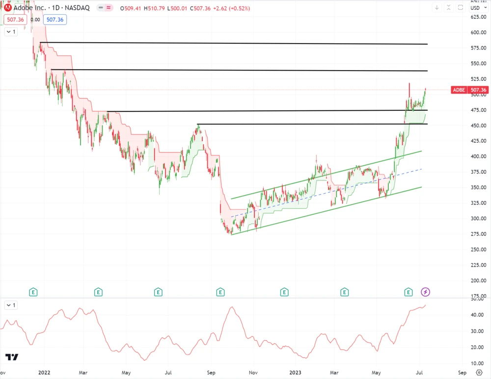 Charttechnisch hat der Kurs das April-Hoch 2022 bei 472,40 Dollar erfolgreich als Support getestet und läuft nun mit voller Wucht nach oben. Mit einem Wert von 45 zeigt der ADX-Indikator einen starken Trend an und auch der Supertrend-Indikator gibt grünes Licht.