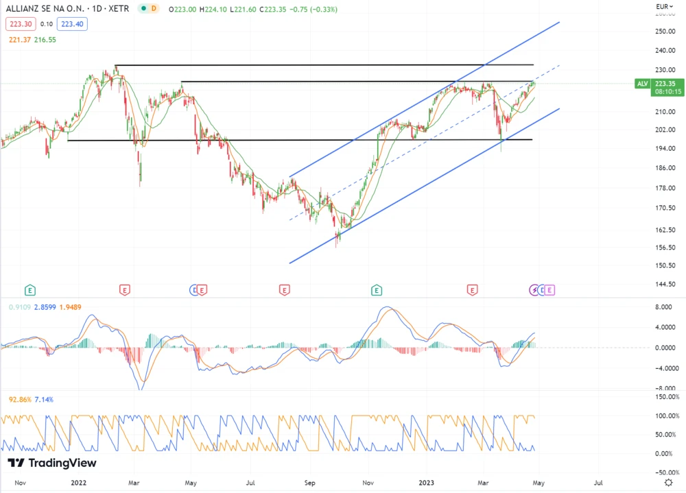 Nachdem die Allianz in einem Aufwärtskanal im März erfolgreich die 197-Euro-Marke als Support getestet hatte, befindet sie sich jetzt an einer wichtigen Widerstandszone zwischen der horizontalen Linie bei 224,35 Euro und der Mittellinie des Trendkanals. Zwei kürzlich aktivierte technische Signale erhöhen die Chancen auf eine Aufwärtsbewegung deutlich.