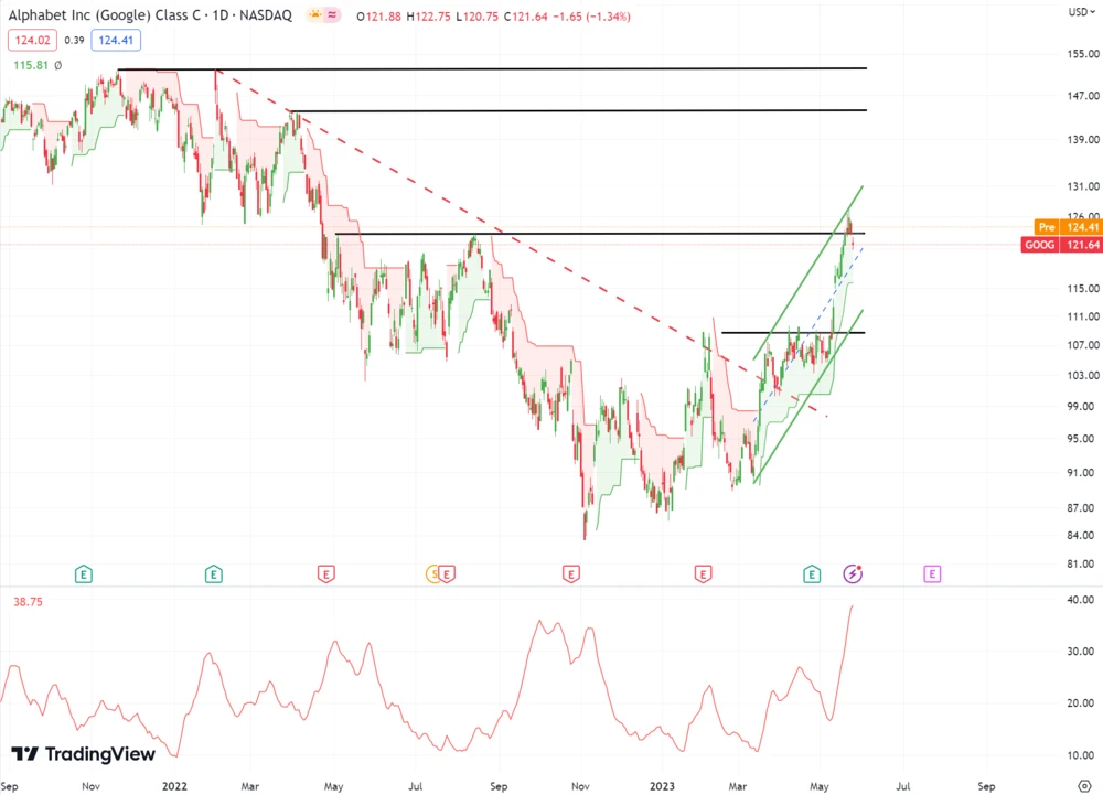 Wie eine Rakete ist die Alphabet-Aktie aus einer wichtigen Widerstandszone nach oben geschossen. Getragen von den letzten positiven Quartalszahlen hat es das Unternehmen geschafft, das April-Hoch 2023 hinter sich zu lassen und auf ein 52-Wochen-Hoch zu steigen. Nun könnte sie bald einen neuen Anlauf auf das April-Hoch 2022 unternehmen.