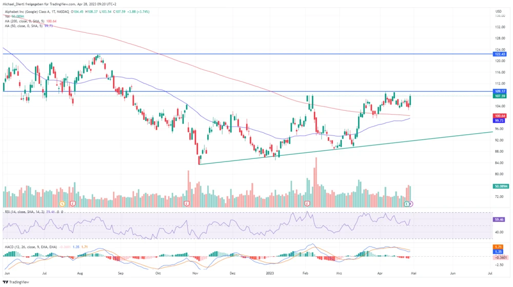 Rund ein Viertel hat die Google-Mutter seit Jahresbeginn an Wert hinzugewonnen und notiert seit mehreren Wochen stabil über der 100-Dollar-Marke. Ein wichtiger Support hat sich bewährt und das bevorstehende Kaufsignal sollte die Papiere von Alphabet auf ein neues Jahreshoch und darüber hinaus führen.