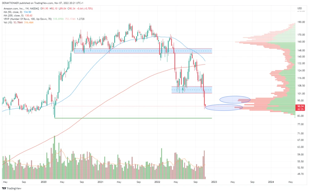 Während des anhaltenden Abverkaufs konnte sich der Titel noch nicht einmal am Volume-Peak um 95 Dollar stabilisieren. Unter konstant hohem Handelsvolumen rauschte der Kurs stattdessen nun bis an das nächste Volume-Peak bei 89 Dollar. Sollte auch dieser Support unterschritten werden, dürfte es weiter bis an das Corona-Tief bei 81,30 Dollar gehen.