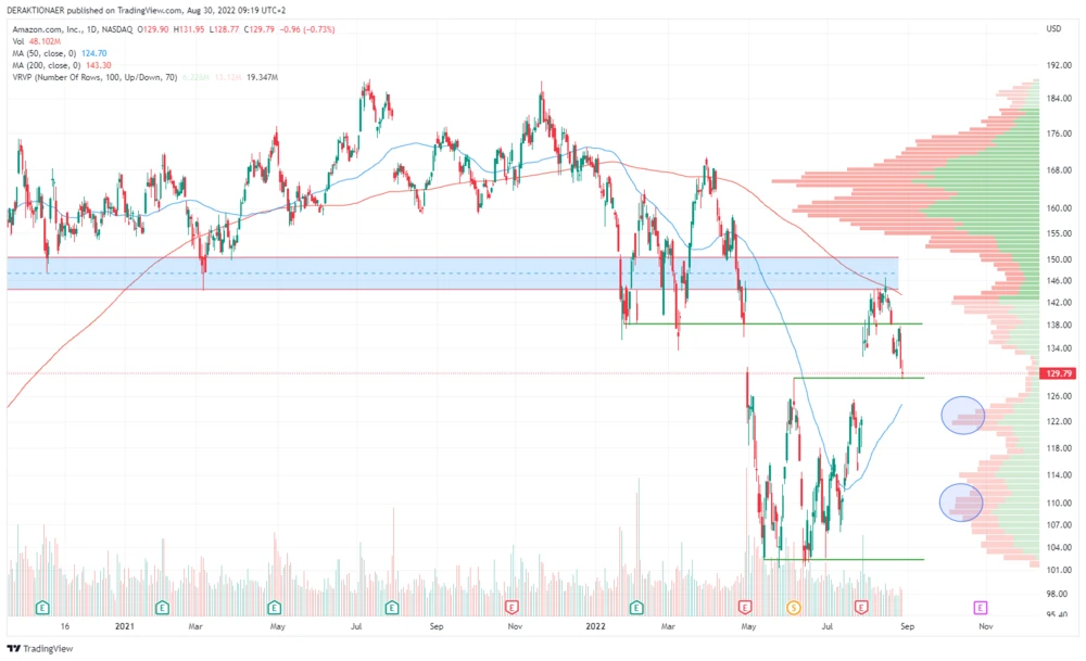 Mit dem Kurssprung infolge der Quartalszahlen gelang der Amazon-Aktie das Break. In einem Zug konnte der Widerstand am Juni-Hoch bei 128,99 Dollar überwunden werden. Wenige Handelstage darauf glückte der Sprung über die zuvor mehrfach angelaufene Horizontale bei rund 138 Dollar. Doch die gute Stimmung kippte schnell. Unter fallendem Volumen prallte der Titel an der Widerstandszone zwischen 144 und 150 Dollar ab, die von mehrfach angelaufenen Zwischentiefs sowie der 200-Tage-Linie ausging.