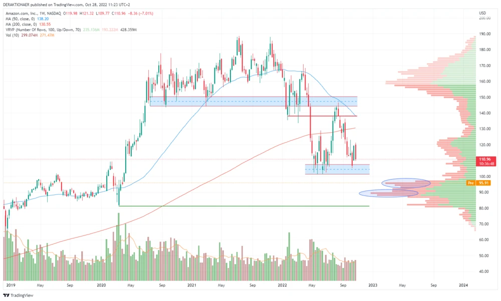 Kann die Amazon-Aktie diesen Bereich am heutigen Freitag auf Schlusskursbasis nicht zurückerobern, wird ein Verkaufssignal ausgelöst. Dann ist es recht wahrscheinlich, dass der Titel die zwei Volume-Peaks bei 95 und 89 Dollar anvisiert. Darunter dient das Corona-Tief bei 81,30 Dollar als letztes Auffangnetz.