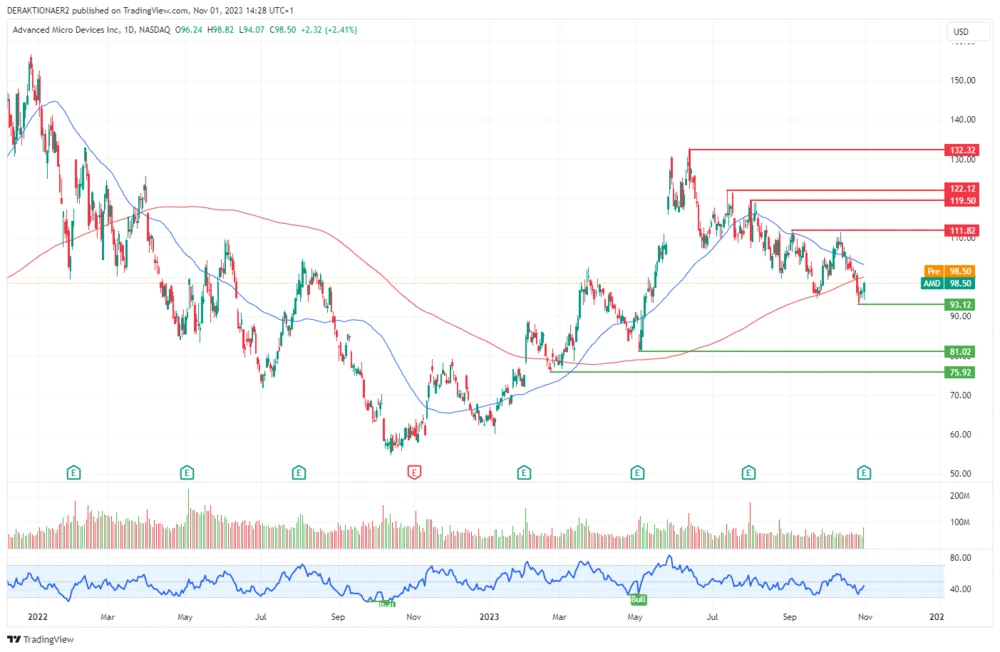 Das US-Analysehaus Bernstein Research hat das Kursziel für AMD nach Zahlen zum dritten Quartal von 95 auf 100 US-Dollar angehoben und die Einstufung auf "Market-Perform" belassen. Einer soliden Quartalsbilanz stehe ein schwacher Ausblick auf das Schlussquartal 2023 gegenüber, schrieb Analyst Stacy Rasgon in einer am Mittwoch vorliegenden Studie. Die Marktschätzungen für den Halbleiterhersteller dürften nun sinken. Immerhin habe das Management in der Telefonkonferenz "den Traum von Künstlicher Intelligenz am Leben erhalten". Die Aktie konsolidiert bereits seit Jahreshoch im Juni bei 132,32 Dollar. Die vergangenen Tage waren freundlich und die Bullen versuchen, die psychologisch wichtige 100-Dollar-Marke am GD200 nachhaltig zurückerobern.