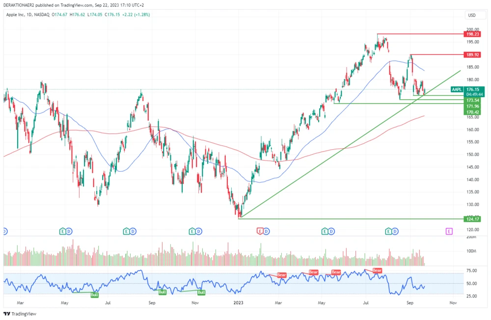 Dem jüngsten Kursrückfall an der Wall Street folgt am Freitag ein Erholungsversuch. Nachdem die Aussicht auf vermutlich noch eine längere Periode mit hohen Zinsen die Anleger in den vergangenen Handelstagen vergrätzt hatte, trauen sich vor dem Wochenende einige Mutige vor und nutzen die günstigeren Kurse für sich. Für die Apple ist die freundliche Stimmung wichtig, denn die Aktie notiert an einer kritischen Stelle.