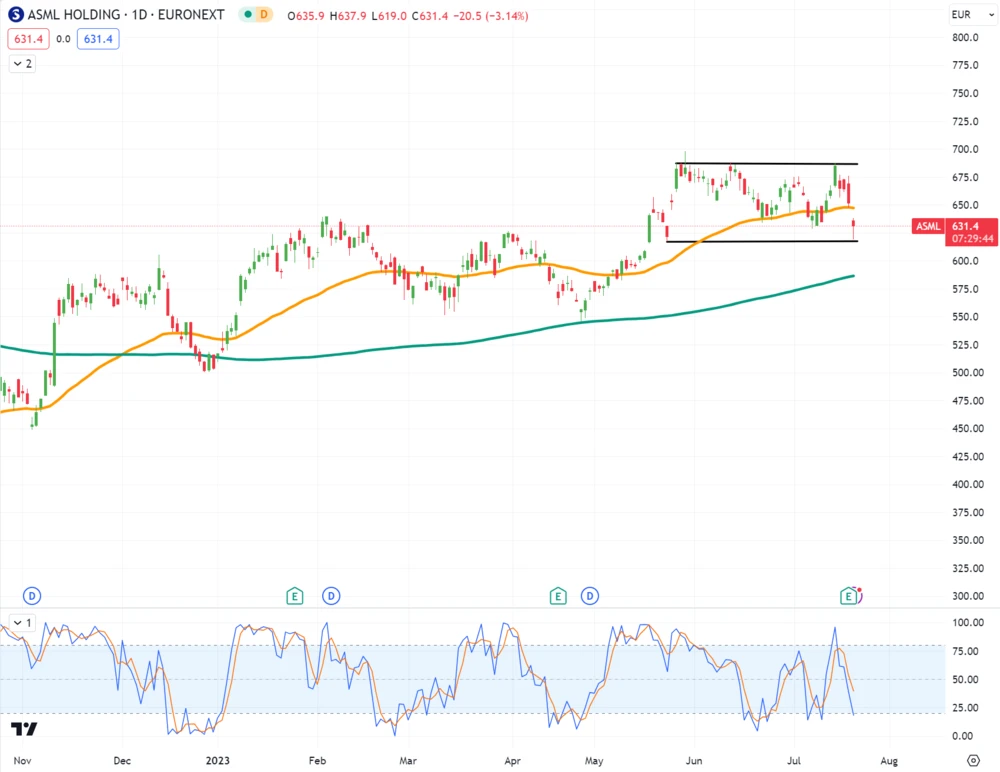 ASML legt seit Ende Mai eine Verschnaufpause ein. Seit Anfang des Jahres hat die Aktie des niederländischen Hightech-Unternehmens in der Spitze rund 37 Prozent an Wert zugelegt, doch an das im Mai erreichte Hoch kommt sie aufgrund des eigenen Gewinnrückgangs und der schwachen Chip-Nachfrage bei Taiwan Semiconductor erst einmal nicht mehr heran.