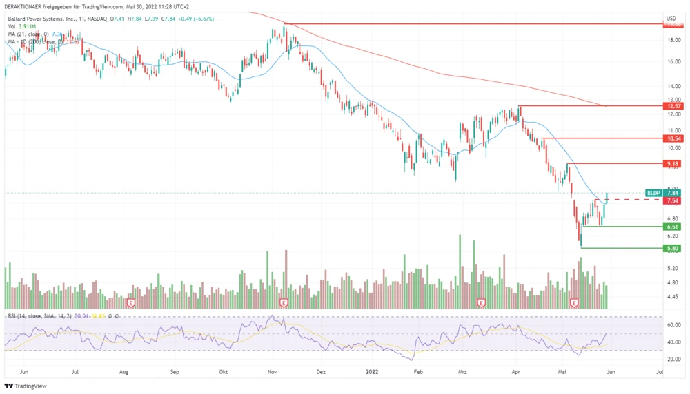 Zur Monatsmitte im Mai fiel die Ballard-Power-Aktie noch auf ein Mehrjahrestief bei 5,80 Dollar und notierte damit so tief wie seit Dezember 2019 nicht mehr. Nach dem starken Anstieg von 6,7 Prozent am vergangenen Freitag kletterte die Aktie auf den höchsten Stand seit vier Wochen bei 7,84 Dollar. Somit verteuerten sich die Anteilsscheine in nur zwei Wochen um 35,1 Prozent.
