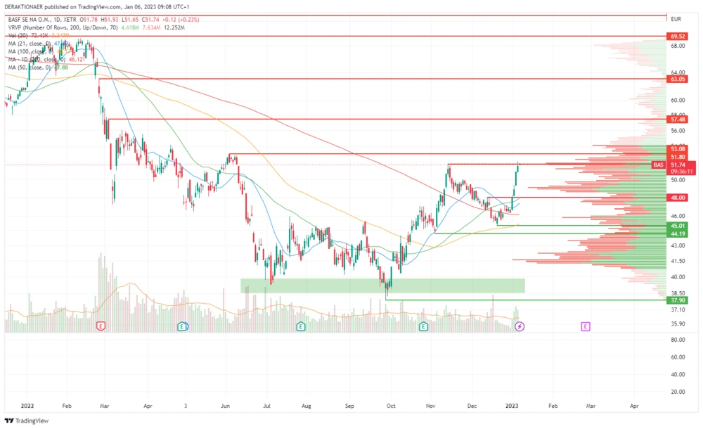 Die BASF-Aktie ist stark in das neue Börsenjahr gestartet. Zuletzt konsolidierte der Titel für rund sechs Wochen und sackte Ende Dezember sogar unter die wichtige 200-Tage-Linie im Bereich der 46-Euro-Marke. Etwas tiefer, bei der 45-Euro-Marke, stoppte dann die Dominanz der Bären und die Bullen übernahmen wieder das Ruder. Inzwischen ist der Kurs wieder deutlich über den GD200 gestiegen.
